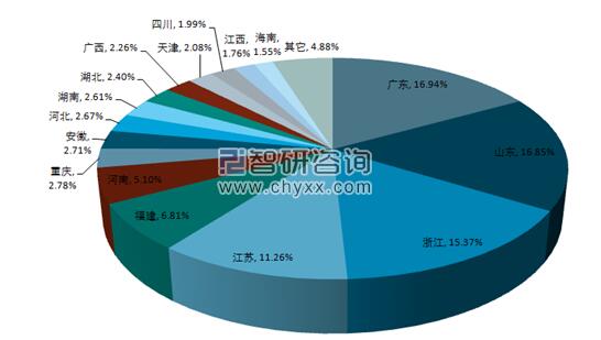 資料來(lái)源:中國(guó)造紙協(xié)會(huì) 有數(shù)據(jù)顯示:2016年全國(guó)紙及紙板總產(chǎn)量10855萬(wàn)噸,2017年11130萬(wàn)噸,凈增長(zhǎng)量275萬(wàn)噸。從區(qū)域生產(chǎn)情況來(lái)看,2017年廣東省紙及紙板產(chǎn)量1885萬(wàn)噸,同比增長(zhǎng)2.45%,居全國(guó)第一,占全國(guó)總產(chǎn)量的16.94%,山東省紙及紙板總產(chǎn)量為1875萬(wàn)噸,僅以10萬(wàn)噸的差距排名第二,同比增長(zhǎng)1.35%,占全國(guó)總產(chǎn)量的16.85%,廣東和山東兩省紙及紙板的產(chǎn)量合計(jì)約占到全國(guó)總產(chǎn)量三分之一。浙江以1711萬(wàn)噸位于全國(guó)第三位,同比增長(zhǎng)1.24%,占全國(guó)總產(chǎn)量的15.37%,廣東、山東、浙江三省產(chǎn)量合計(jì)達(dá)5471萬(wàn)噸,占了全國(guó)產(chǎn)量的49.16%,基本上剛好一半,江蘇1253萬(wàn)噸居第四位,同比下降2.49%,占全國(guó)總產(chǎn)量的11.26%,福建和河南的紙及紙板產(chǎn)量分別為758萬(wàn)噸和568萬(wàn)噸,其他省市區(qū)的產(chǎn)量均低于500萬(wàn)噸。 2017年主要省市紙及紙板產(chǎn)量占比