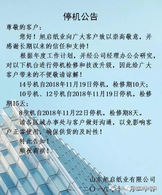 紙企旺季扎堆停機 11月20日,山東旭啟紙業(yè)發(fā)布停機公告。公司表示,根據(jù)年度工作計劃,并經(jīng)公司經(jīng)理辦公會研究,對4個機臺進行停機檢修和技改升級。 14號機自2018年11月19日停機,檢修期10天; 10號機、12號機自2018年11月19日停機,檢修期15天; 8號機自2018年11月22日停機,檢修期8天。