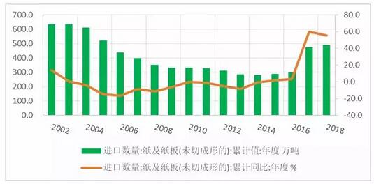 2014年-2017年中國紙及紙板進口量增長,2017年中國紙及紙板進口量為475萬噸,同比增長60%。2018年1-9月中國紙及紙板進口量為490萬噸,同比增長55.4%。 圖1:國內紙及紙板進口(數量)情況: