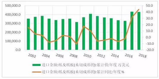 數據來源:Wind中州期貨 從金額方面來看,2013年-2016年中國紙及紙板進口金額下降,2016年中國紙及紙板進口金額為32.79億美元,同比下降2.1%。2017年中國紙及紙板進口金額增長,2018年1-9月中國紙及紙板進口金額為42.89億美元,同比增長44.2%。 圖2:國內紙及紙板進口(金額)情況: