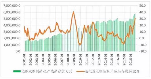 數據來源:Wind中州期貨 目前國內進口紙及紙制品大多為低檔包裝紙、新聞紙等,但進口紙及紙制品的質量一般優于國產紙,且價格低于國產紙制品價格。外紙進口的大幅增加,對本就低迷的市場造成進一步的沖擊。 根據中國造紙協會的統計,2018年1-9月,全國生產各類紙張8866萬噸,同比下降7.2%。生產紙制品4236萬噸,同比下降21.6%,其中紙箱產量2121萬噸,同比下降28.3%。 1-9月份紙箱產量下滑28%全產業鏈利潤下降20%。今年1-9月份,全行業利潤同比下降20%。1-9月份,全行業主營收入1.0578萬億元,同比下降10%,利潤591億元,同比下降20%。 由于國內經濟下行壓力加大及出口貿易導致包裝用紙需求萎縮等因素影響,今年紙及紙板存貨同比增長30%以上,預計今年造紙行業生產和消費總量將會出現減少。受廢紙進口政策逐漸加嚴及匯率變化等影響,將給造紙產品的生產和消費平穩發展帶來不穩定因素。 圖3:國內造紙及紙制品存貨情況  數據來源:Wind中州期貨 前國內瓦楞紙及箱板紙市場需求一般,成本向下轉移難度較大,進口商利潤將遭受壓縮。 隨著原產于美國的瓦楞紙、箱板紙進口量的減少,將利好國產高端產品需求釋放。特別對于規模造紙企業來說,擁有相對充足的原料供應以及掌握先進的生產設備和技術,在搶占市場份額方面將更勝一籌,也將更有助于行業集中度提升。