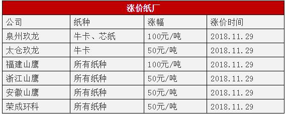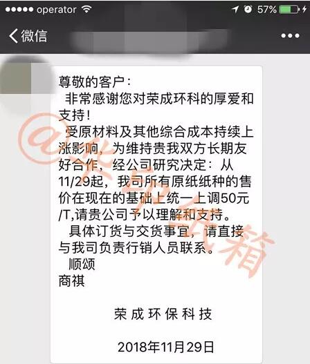 榮成跟漲50元/噸,今天起玖龍(泉州、太倉(cāng))、山鷹(安徽、浙江、福建)齊漲價(jià) 11月28日一大早,江蘇榮成環(huán)科股份有限公司(簡(jiǎn)稱“榮成環(huán)科”)亦對(duì)外發(fā)布漲價(jià)通知。公司稱受原材料及其他綜合成本持續(xù)上漲影響,為維持貴我雙方長(zhǎng)期友好合作,經(jīng)研究決定從2018年11月29日起,公司所有原紙紙種的售價(jià)統(tǒng)一上調(diào)50元/噸。