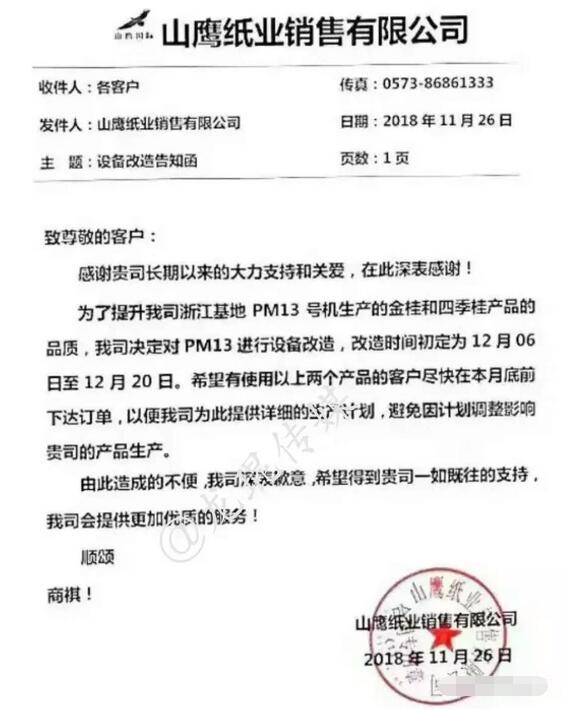 浙江山鷹紙業(yè):PM13進(jìn)行設(shè)備改造,改造時(shí)間初定為12月6日至12月20日。停機(jī)時(shí)長(zhǎng)15天左右,影響金桂和四季桂。
