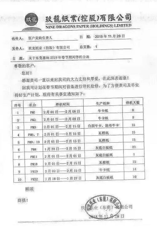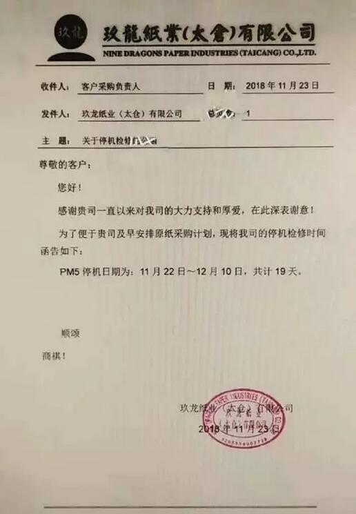 【摘要】注意了!注意了!紙業(yè)巨頭開(kāi)始年底沖刺了!紙價(jià)能否逆風(fēng)翻盤或就在這最后一搏!11月27日玖龍、山鷹發(fā)布漲價(jià)函后,28日另一巨頭榮成迫不及待加入陣營(yíng)。今天(11月29日)起,榮成、玖龍、山鷹將集體上調(diào)成品紙價(jià)格,東莞玖龍28日也發(fā)布了春節(jié)停機(jī)計(jì)劃,10臺(tái)紙機(jī)將停機(jī)檢修4-23天。提醒各位做好排產(chǎn)安排!