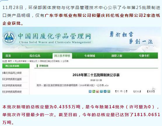 又到了年終收關(guān)階段,包裝紙行業(yè)經(jīng)歷了一個(gè)混沌的逢8之年。在尾聲階段,受到包裝紙需求異常疲軟的影響,各大紙企紛紛采取了停機(jī)保價(jià)的策略,受此影響,國廢價(jià)格持續(xù)低迷,紙價(jià)易跌難漲。 鑒于今年進(jìn)入原紙大增和實(shí)際需求萎縮的影響,造紙行業(yè)對進(jìn)口外廢的需求興趣不大,1800萬噸的批文,實(shí)際上遠(yuǎn)超預(yù)期,因此,今天環(huán)保部固體廢物與化學(xué)品管理技術(shù)中心公布的本年第25批外廢批文中,僅有一家企業(yè)獲得了4355噸。