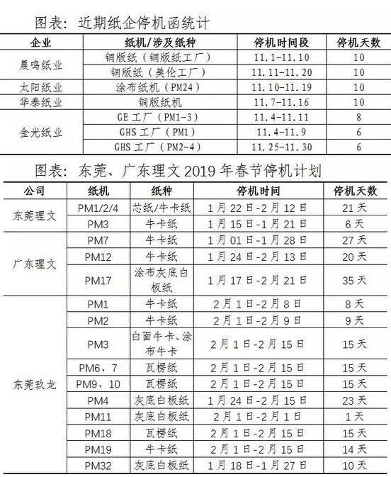 紙價多降至年內(nèi)低位,瓦楞紙價跌超8% 四季度為包裝紙傳統(tǒng)旺季,但隨著原材料價格回落、新增產(chǎn)能投產(chǎn)、需求端相對疲弱等影響的逐步顯現(xiàn),各主流紙種價格回落,紙價多降至年內(nèi)低位,此外,紙漿期貨下跌帶動了槳紙系紙價的加速下跌。 11月,受原料廢紙價格持續(xù)回落影響,包裝紙價格下跌,瓦楞紙價格下跌超過8%;白卡紙廠提價計劃落空,需求不旺紙價不漲反跌,價格已降至成本線附近。 紙企頻發(fā)停機(jī)函,2018漲價無望 在市場低迷情況之下,紙業(yè)龍頭陸續(xù)發(fā)布停機(jī)函,短期來看將在一定程度上緩解供給端壓力,長期來看紙業(yè)板塊跟蹤的重點仍在于需求端的拉動效應(yīng)。