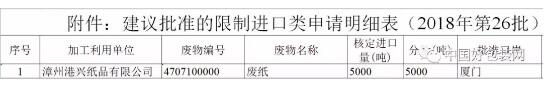 第26批廢紙進口許可名單公示,審批總量僅有5000噸 12月7日,中國固化廢管理網公布今年第26批廢紙進口許可名單,僅有一家紙廠獲批:福建漳州港興紙業獲批5000噸外廢額度。據統計,這已是連續第三批僅有一家紙廠獲批外廢額度: 11月16日,第24批廢紙進口許可名單公示,僅有東莞建暉紙業有限公司獲批,核定進口量約14萬噸; 11月28日,第25批廢紙進口許可名單公示,僅有肇慶市科倫紙業有限公司獲批,核定進口量為4855噸; 12月7日,第26批廢紙進口許可名單公示,僅有福建漳州港興紙業獲批,核定進口量為5000噸。