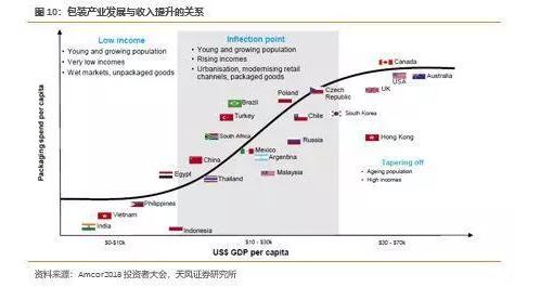趨勢:集中度提升+服務(wù)模式升級 隨著生活與收入水平提升、家庭平均規(guī)模變小,全球消費(fèi)者對于產(chǎn)品的精致化、小型化、便攜化需求日益提高,包裝設(shè)計(jì)已成為產(chǎn)品價(jià)值的重要組成部分,進(jìn)而帶動包裝行業(yè)產(chǎn)銷量與規(guī)模逐年上升。 根據(jù)Amcor對收入水平與包裝支出的關(guān)系進(jìn)行統(tǒng)計(jì)發(fā)現(xiàn): 當(dāng)人均GDP在較低水平時(shí),消費(fèi)者對于包裝的需求和支出水平較低,例如印度、越南和菲律賓,當(dāng)?shù)叵M(fèi)市場主要以傳統(tǒng)市集為主,產(chǎn)品呈無包裝原始狀態(tài),包裝產(chǎn)業(yè)較為落后;當(dāng)收入逐步提升,消費(fèi)觀逐步進(jìn)化,對于產(chǎn)品包裝的訴求開始加強(qiáng),人均平均包裝支出迅速提升,例如中國、南非、韓國等國,當(dāng)?shù)匾殉霈F(xiàn)成熟的零售渠道及包裝產(chǎn)品,包裝產(chǎn)業(yè)蓬勃發(fā)展; 當(dāng)收入繼續(xù)提升,人均GDP超過30000美金后,包裝產(chǎn)業(yè)紅利逐步消失,消費(fèi)者對于產(chǎn)品的包裝訴求基本滿足,人均包裝支出增速逐步放緩,例如美國、英國、澳大利亞等發(fā)達(dá)國家。 我國目前正處于第二階段,包裝產(chǎn)業(yè)受益于人口及收入提升所帶來的規(guī)模紅利蓬勃發(fā)展,尤其隨著消費(fèi)者對于產(chǎn)品質(zhì)量、食品安全、較長保存期限及較小規(guī)格產(chǎn)品的需求提升,包裝產(chǎn)業(yè)仍有很大可提升空間。
