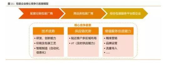 包裝企業(yè)本身作為下游客戶的配套廠商,議價(jià)能力及產(chǎn)品附加值空間受限,因此提高客戶粘性、創(chuàng)造增量價(jià)值才能從“配套廠商”進(jìn)化為“綜合服務(wù)商”,進(jìn)而提升對上下游的議價(jià)能力,同時(shí)整合經(jīng)營結(jié)構(gòu),優(yōu)化營運(yùn)效率,提高公司的綜合競爭力及盈利表現(xiàn)。從上述產(chǎn)業(yè)模式特征及Amcor發(fā)展經(jīng)驗(yàn)來分析,我們認(rèn)為擁有“技術(shù)優(yōu)勢”、“供應(yīng)鏈優(yōu)勢”和“增值服務(wù)創(chuàng)造能力”是成為包裝產(chǎn)業(yè)龍頭所必須具備的核心競爭力。 技術(shù)優(yōu)勢:因終端客戶需求的迭代速度及要求不斷提升,下游客戶對于包裝展示的重視度與標(biāo)準(zhǔn)持續(xù)增加,尤其是消費(fèi)品行業(yè),有美感、視覺沖擊力的外包裝才能誘發(fā)消費(fèi)者的購買欲,所以能夠根據(jù)不斷變化的消費(fèi)者需求來改進(jìn)和更新產(chǎn)品設(shè)計(jì)的包裝廠商才能夠持續(xù)綁定下游客戶,獲得穩(wěn)定且有議價(jià)力的訂單。另一方面,為提升運(yùn)營效率,需要對自動化生產(chǎn)、信息化等系統(tǒng)做出相應(yīng)投入和改進(jìn),從而保證相對較高的盈利水平。供應(yīng)鏈優(yōu)勢:由于包裝本身作為附屬產(chǎn)品,需要協(xié)同客戶的生產(chǎn)速度及訂單量進(jìn)行匹配供應(yīng),滿足客戶在訂單高峰期時(shí)的及時(shí)供應(yīng)需求;同時(shí)為節(jié)省物流成本及供應(yīng)時(shí)間,需要盡可能貼近客戶區(qū)域供應(yīng)。 增值服務(wù)創(chuàng)造能力:在傳統(tǒng)包裝供應(yīng)的業(yè)務(wù)基礎(chǔ)之上,為客戶提供多元化的增值服務(wù)逐漸成為包裝廠商所必須的核心競爭優(yōu)勢之一。增值服務(wù)可包括但不限于數(shù)據(jù)采集、精準(zhǔn)營銷、鑒真防偽、品牌運(yùn)營等,旨在為客戶提供整體包裝解決方案,增加產(chǎn)品與服務(wù)附加值,提高客戶粘性。