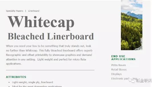 在NDPaper官網介紹漂白牛皮箱板紙的文件中,公司表示產品是一種單層低克重紙板,適用于制作披薩盒、零售包裝盒等終端應用場合。產品克重為15-lb、18-lb、21-lb以及24-lb,即74gsm、89gsm、104gsm以及118gsm。