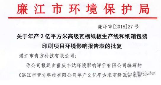 2018年12月27日,廣東省湛江市廉江市環境保護局發布了“關于年產2億平方米高級瓦楞紙板生產線和紙箱包裝印刷項目環境影響報告表的批復”的公示。