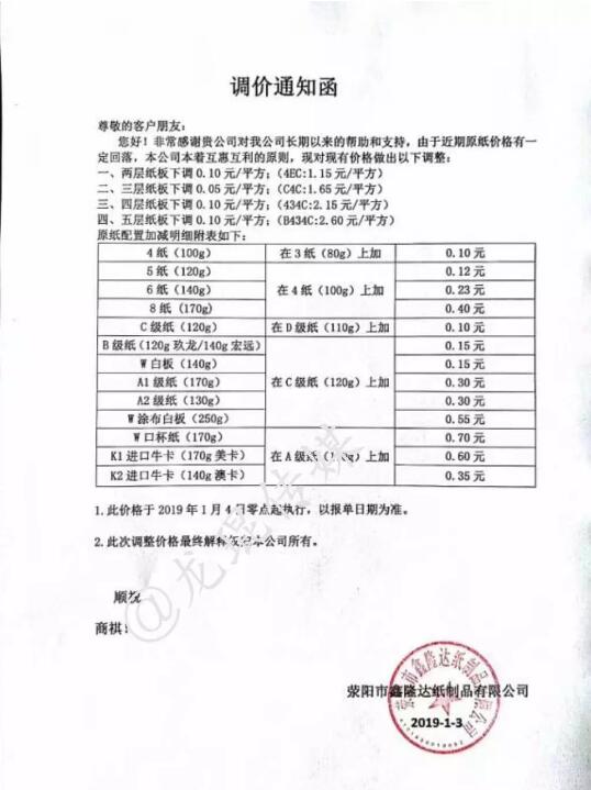正值杭州富陽紙廠狂發(fā)白板紙漲價(jià)函之際,2019年1月3日,滎陽市鑫隆達(dá)紙制品有限公司發(fā)布降價(jià)函: 1、兩層紙板下調(diào)0.10元/平方:(4EC:1.15元/平方); 2、三層紙板下調(diào)0.05元/平方:(CAC:1.65元/平方); 3、四層紙板下調(diào)0.10元/平方:(434C:2.15元/平方); 4、五層紙板下調(diào)0.10元/平方:(B434C:2.60元/平方)。
