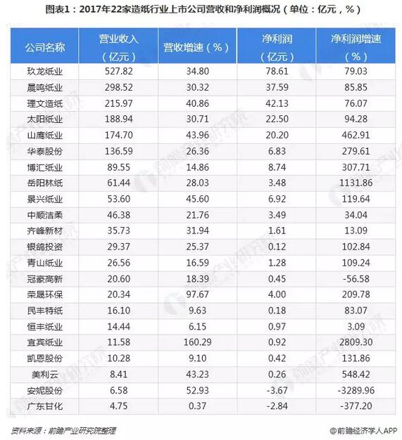 超1/3企業凈利潤同比下滑,業績表現欠佳 目前,包括港股上市的玖龍紙業和理文紙業在內,國內造紙行業的主要有22家上市公司。從2017年全年的業績表現來看,造紙行業2017年的業績表現普遍向好,所有公司的營收都有所擴張,其中僅安妮股份、廣東甘化2家公司的凈利潤出現下滑,數量占比不到10%。其中,年營收規模超過100億元的有6家公司,凈利潤規模突破20億元的有5家公司,玖龍紙業在營收規模和凈利潤規模上均遙遙領先與其他企業,穩居行業第一。總體來看,目前在營收和凈利潤規模處于行業領先地位的主要是玖龍紙業、晨鳴紙業、理文紙業、太陽紙業和山鷹紙業。