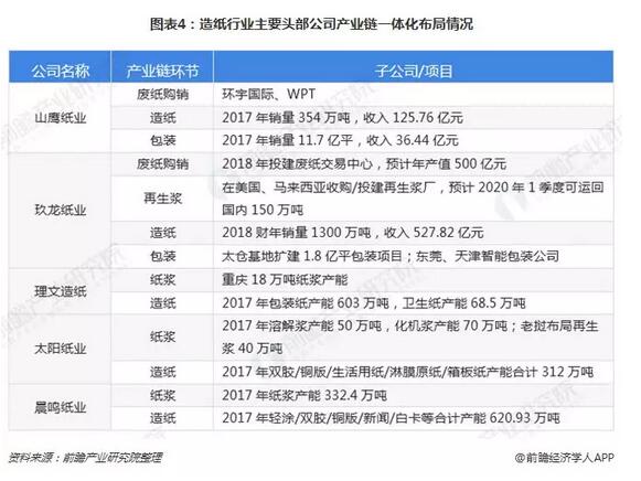 緩解供需雙邊擠壓困境,產業鏈一體化趨勢突顯 從產業鏈的角度來看,造紙行業屬于中游制造行業,其上游是紙漿、廢紙等原料,下游是包裝行業,而造紙企業能否獲得可觀收益與原材料供給是否充足和下游需求是否旺盛密切相關。一方面,目前,我國造紙行業存在較大的原材料海外依賴性,2018年以來,外廢配額收緊、貿易摩擦影響紙漿進口等因素導致造紙原材料供應緊張,造紙成本大幅攀升;另一方面,下游包裝環節需求不振,也導致造紙行業庫存不斷攀升,企業創收也面臨困境。供需雙邊壓力最終導致企業業績頹勢。 而為了環節這一現狀,造紙企業紛紛通過向上下游的延伸,向產業鏈一體化方向發展,以實現從源頭控制原材料降低成本,開拓包裝業務緩解需求受市場波動影響程度。以山鷹紙業為例,該公司是目前一體化最完善的企業,公司2017年造紙業務和包裝業務收入占比分別為72%和21%,可見下游包裝業務發展成效顯著;2018年山鷹紙業收購荷蘭廢紙收購企業WPT,完善廢紙—原紙—包裝—廢紙的產業鏈閉環。此外,玖龍紙業的全產業鏈布局也相對完善;而太陽紙業、晨鳴紙業和理文造紙等頭部公司通過在產業鏈上游的紙漿環節進行業務布局來獲得超過行業的成本優勢。