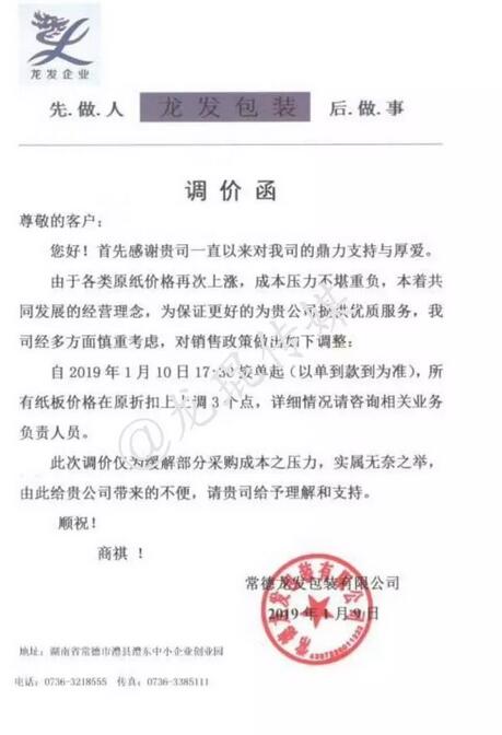 武漢龍發包裝有限公司 自2019年1月7日17:00接單起,紙板價格在現有基礎上上調5%。