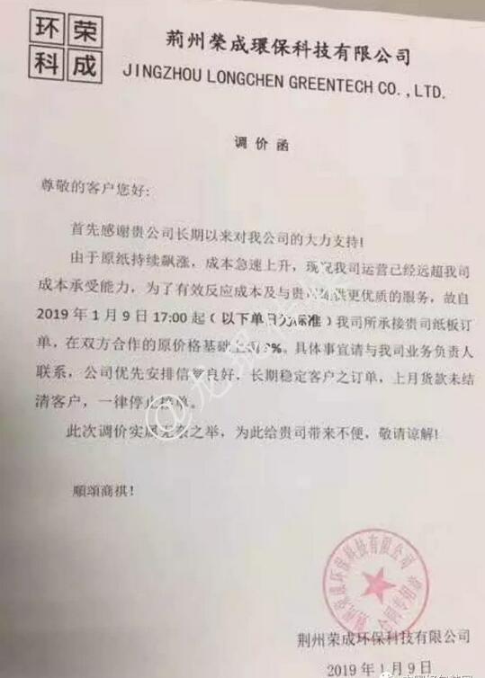 荊州榮成環保科技有限公司 自2019年1月9日17:00起,在原價格基礎上上調3%。