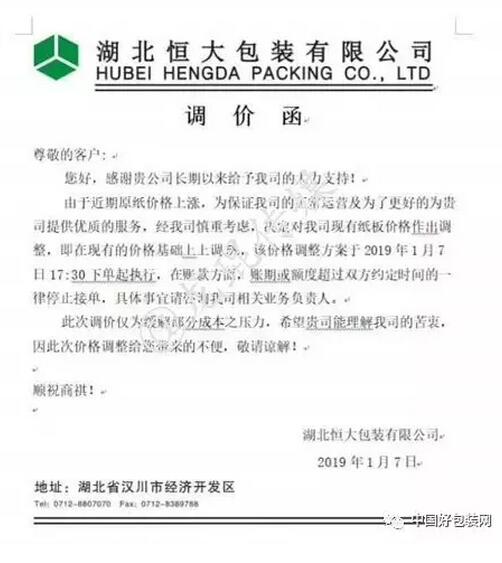 湖北恒大包裝有限公司 自2019年1月7日17:30下單起,紙板價格在現有基礎上上調5%。賬期或額度超過雙方約定時間的一律停止接單。