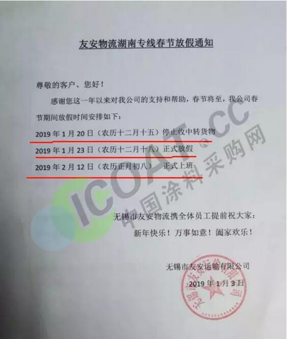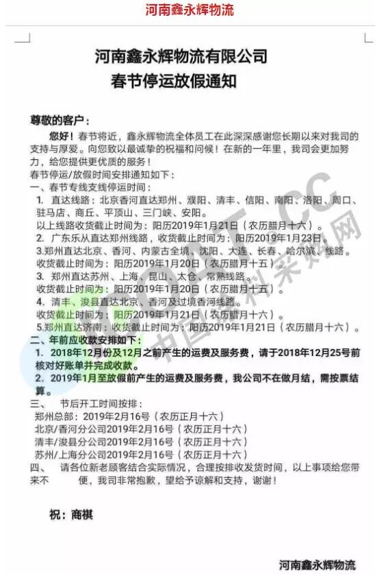 導語:年關將近,很多物流公司都陸續發布了2019年春節停運通知。大部分物流公司從1月20日起開始放假,部分甚至在1月10日、12日就停止收貨。有包裝廠也發出通知,春節將至,工廠放假,物流、運輸休息!要下單的老板們,抓緊啦!