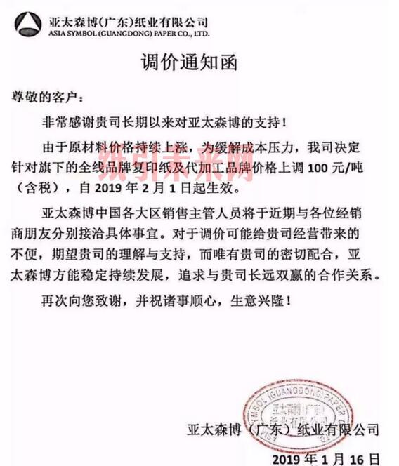亞太森博(廣東)紙業有限公司:由于原材料價格持續上漲,為緩解成本壓力,我司決定針對旗下的全線品牌復印紙及代加工品牌價格上調100元/噸(含稅),自2019年2月1日起生效。