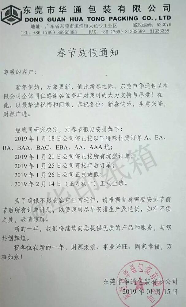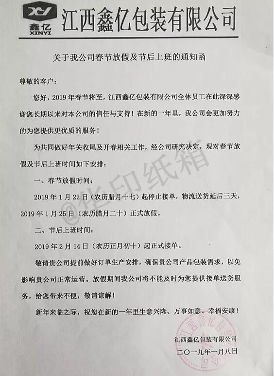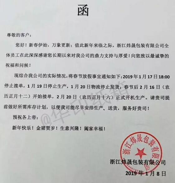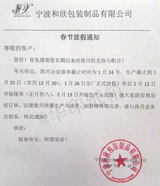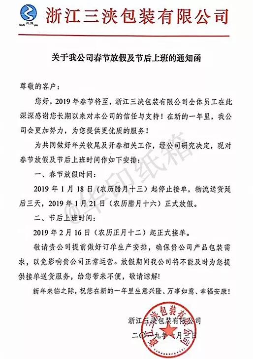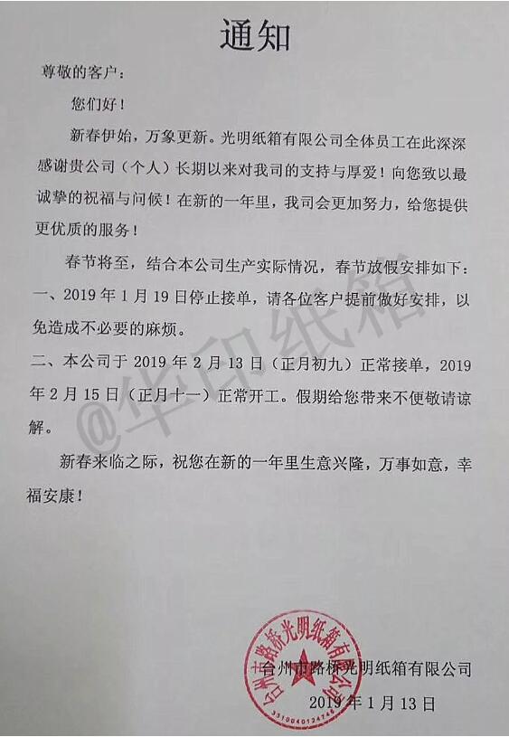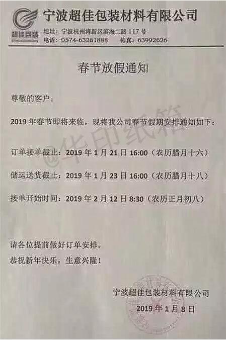 導(dǎo)語(yǔ):節(jié)前買(mǎi)紙箱真的不能再砍價(jià)了,因?yàn)閺?月18日起(農(nóng)歷臘月十三)全國(guó)大批紙箱廠開(kāi)始停止接單了,廣東、浙江、江西、河南、四川等地的紙箱廠已明確發(fā)出放假通知函。節(jié)后復(fù)工的時(shí)間多集中在2月14日(農(nóng)歷正月初十)前后,最晚的要等到2月20日(正月十六)了。