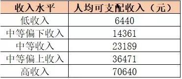 那么,到底什么是人均可支配收入呢? 人均可支配收入,是指居民可用于最終消費支出和儲蓄的總和,即居民可用于自由支配的收入,既包括現金收入,也包括實物收入。 也就是說,除去社保、公積金、個稅等一系列應交款項,剩下的錢,就是你的“可支配收入”。 而根據下表的數據顯示,最低一級的人均可支配收入,也有6440元。