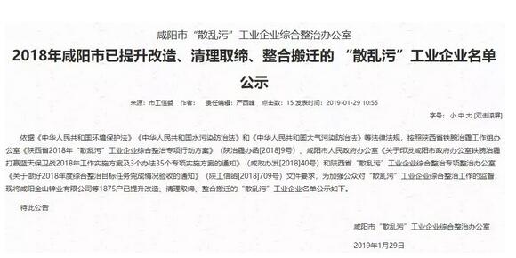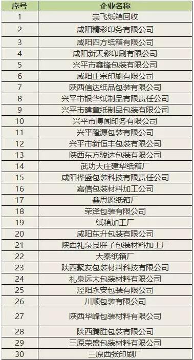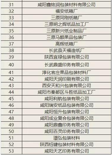 導(dǎo)語:1月29日,咸陽市“散亂污”工業(yè)企業(yè)綜合整治辦公室發(fā)布2018年咸陽市已提升改造、清理取締、整合搬遷的“散亂污”工業(yè)企業(yè)名單,瓦小編獲悉,53家紙箱、紙盒、印刷企業(yè)在內(nèi)。