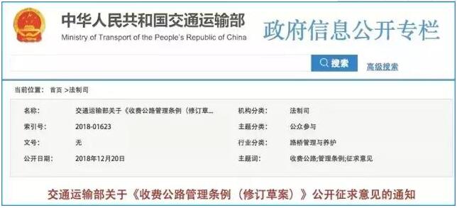重磅!公路收費(fèi)再見(jiàn)!5項(xiàng)新政與你息息相關(guān)! 2019年汽車(chē)行業(yè)一批新的法規(guī)陸續(xù)頒布實(shí)施,它們中或?qū)ζ髽I(yè)有推動(dòng)有束縛,又或?qū)οM(fèi)者有利也有規(guī)范。但終歸,它們將影響大家新一年的用車(chē)生活。或喜或悲,往下看就知道了! 政策一 一二級(jí)公路、橋梁、隧道停止收費(fèi) 2018年12月20日,國(guó)家交通運(yùn)輸部門(mén)在官方網(wǎng)站上公布了《收費(fèi)公路管理?xiàng)l例(修訂草案)》,并開(kāi)始為期一個(gè)月的公開(kāi)意見(jiàn)征集。