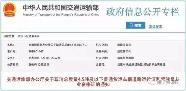 新修訂的管理?xiàng)l例列明以下規(guī)定:提高收費(fèi)公路設(shè)置門(mén)檻,規(guī)定今后新建收費(fèi)公路必須達(dá)到高速公路技術(shù)標(biāo)準(zhǔn);新建一、二級(jí)公路和獨(dú)立橋梁、隧道不得收費(fèi);車(chē)輛通行費(fèi)收入無(wú)法滿足債務(wù)利息和養(yǎng)護(hù)管理支出需求的省份,不得新建收費(fèi)高速公路。此外,還調(diào)整了收費(fèi)站設(shè)置的相關(guān)規(guī)定,推行不停車(chē)收費(fèi),逐步減少人工收費(fèi)方式。 根據(jù)交通部門(mén)發(fā)布的統(tǒng)計(jì)數(shù)據(jù),截止2017年全國(guó)收費(fèi)公路里程16.37萬(wàn)公里,除了高速公路之外,一二級(jí)公路收費(fèi)路段也相當(dāng)龐大,逐步取消收費(fèi)后,相信能為老百姓減輕了不少負(fù)擔(dān),希望可以有高速公路免費(fèi)的那一天! 政策二 營(yíng)運(yùn)證、資格證正式取消 2018年12月25日,交通部官網(wǎng)發(fā)布了《交通運(yùn)輸部辦公廳關(guān)于取消總質(zhì)量4.5噸及以下普通貨運(yùn)車(chē)輛道路運(yùn)輸證和駕駛員從業(yè)資格證的通知》。