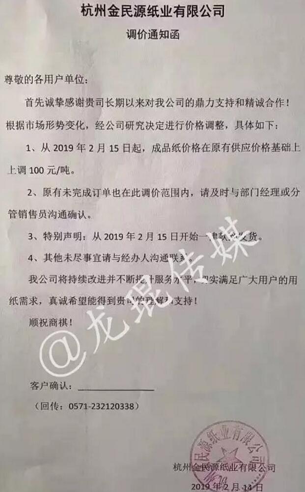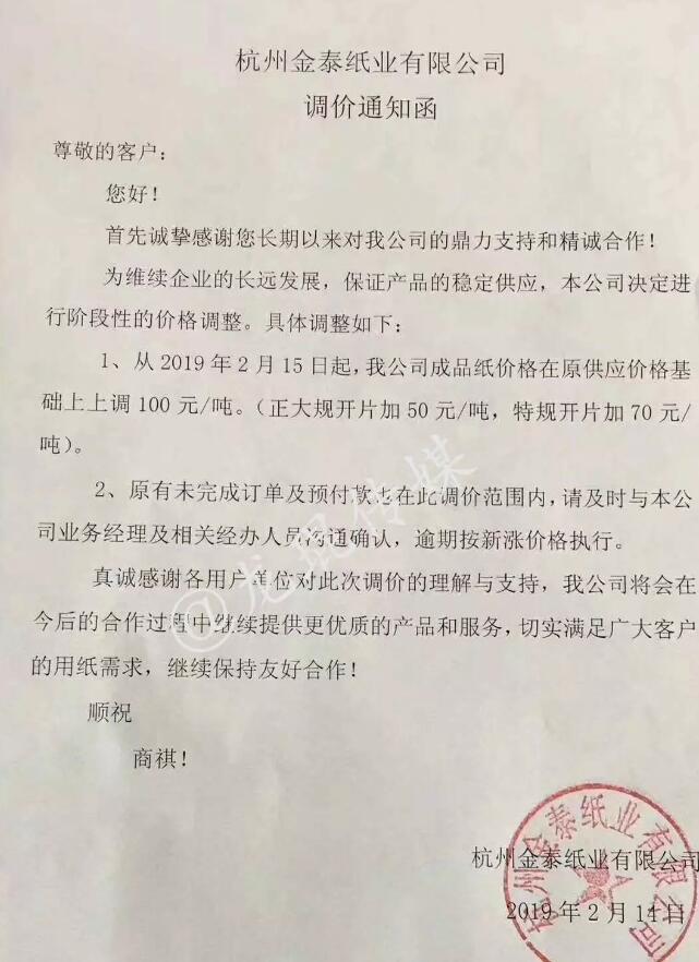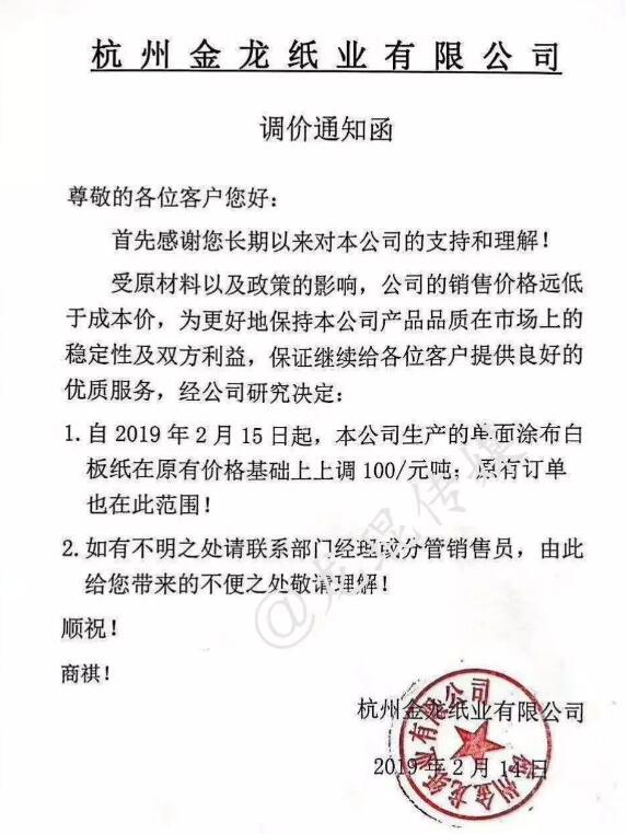 杭州金龍紙業有限公司:自2019年2月15日起,單面涂布白板紙在原有價格基礎上上調100元/噸,原有訂單也在此調價范圍內。