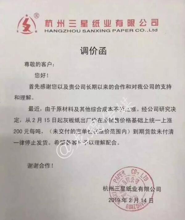 杭州三星紙業有限公司:自2019年2月15日起,灰板紙出廠價在原價格基礎上統一上漲200元/噸,未交付的訂單在漲價范圍內。