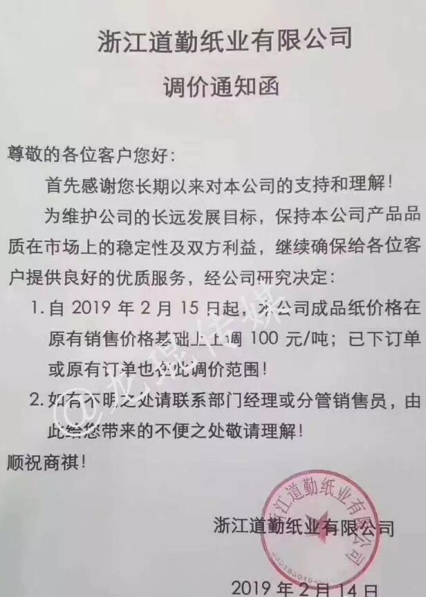 浙江道勤紙業有限公司:自2019年2月15日起,成品紙價格在原有銷售基礎上上調100元/噸,已下訂單或原有訂單也在此調價范圍內。