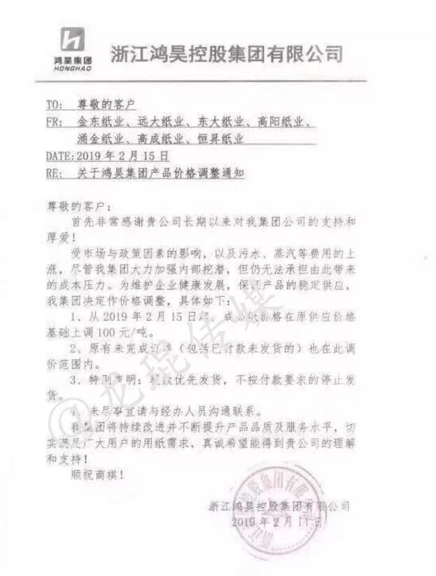 浙江鴻昊控股集團有限公司:自2019年2月15日起,成品紙價格在原供應價格基礎上上調100元/噸,原有訂單也在此調價范圍內。