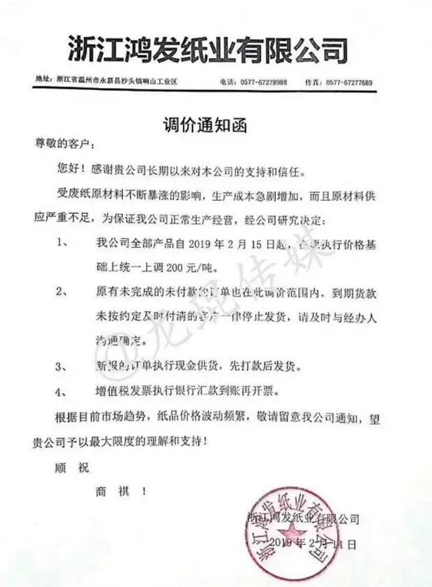 浙江鴻發紙業有限公司:自2019年2月15日起,成品紙價格在原供應價格基礎上上調200元/噸,原有訂單也在此調價范圍內。新報的訂單執行現金供貨,先打款后發貨。