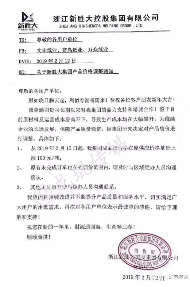 浙江新勝達控股集團有限公司:自2019年2月15日起,成品紙價格在原供應價格基礎上上調100元/噸,原有訂單也在此調價范圍內。