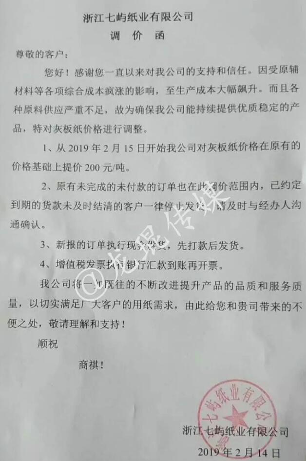 浙江七嶼紙業有限公司:自2019年2月15日起,灰板紙價格在原有價格基礎上提價200元/噸,原有未完成的未付款訂單也在此調價范圍內。