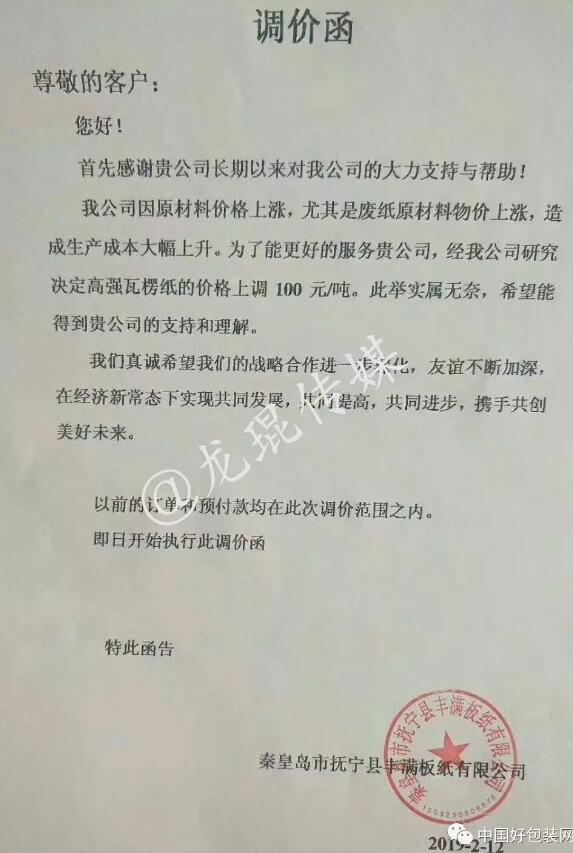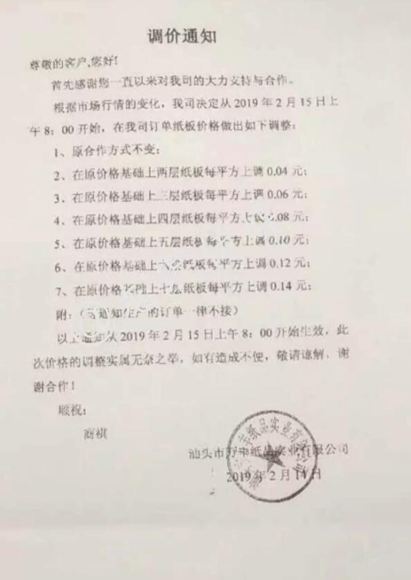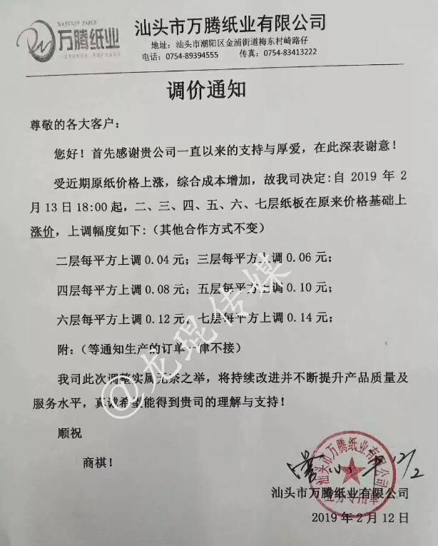 紙板漲價函: 汕頭市萬中紙業有限公司:自2019年2月15日上午8:00起,在原價格基礎上,兩層紙板每平方上調0.04元,三層紙板每平方上調0.06元,四層紙板每平方上調0.08元,五層紙板每平方上調0.10元,六層紙板每平方上調0.12元,七層紙板每平方上調0.14元。