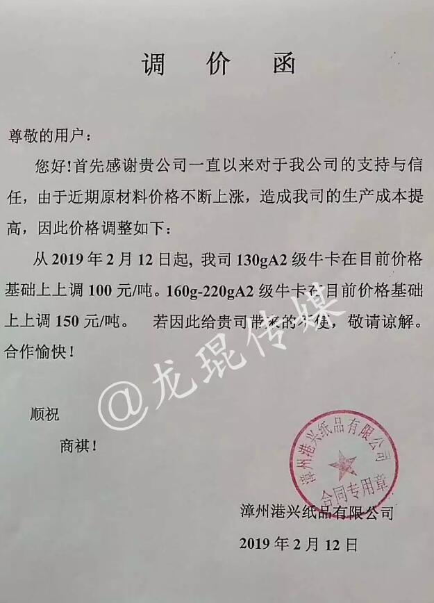漳州港興紙品有限公司:自2019年2月12日起,130gA2級牛卡在目前價格基礎上上調100元/噸。160g-220gA2牛卡在目前價格基礎上上調150元/噸。