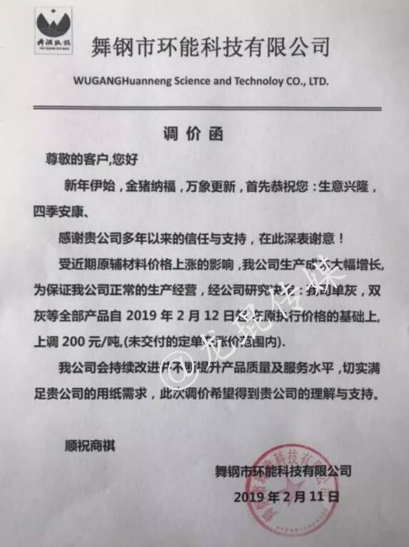 舞鋼市環能科技有限公司:自2019年2月12日起,在原執行價格基礎上上調200元/噸。
