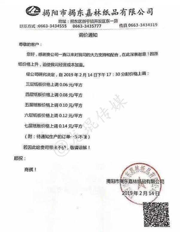 揭陽市揭東嘉林紙品有限公司:自2019年2月14日下午17:30起,三層紙板上漲0.06元/平方,四層紙板上漲0.08元/平方,五層紙板上漲0.10元/平方,六層紙板上漲0.12元/平方,七層紙板上漲0.14元/平方,待通知生產的訂單一律不接。