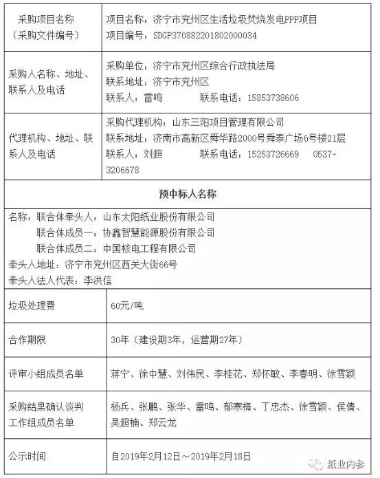 2月11日,中國政府采購網發布濟寧市兗州區生活垃圾焚燒發電PPP項目預中標公示。公示顯示,預中標人名稱為:山東太陽紙業股份有限公司(聯合體牽頭人)、協鑫智慧能源股份有限公司(聯合體成員一)和中國核電工程有限公司(聯合體成員二)。預中標的垃圾處理費為一噸60元,合作期限為30年(建設期3年,運營期27年)。