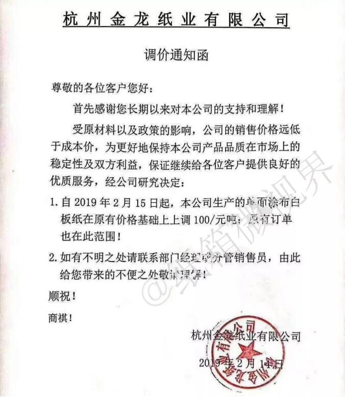 2月14日,杭州金龍紙業有限公司發布漲價函: 自2019年2月15日起,單面涂布白板紙在原有價格基礎上上調100元/噸。 原有訂單也在此調價范圍內。