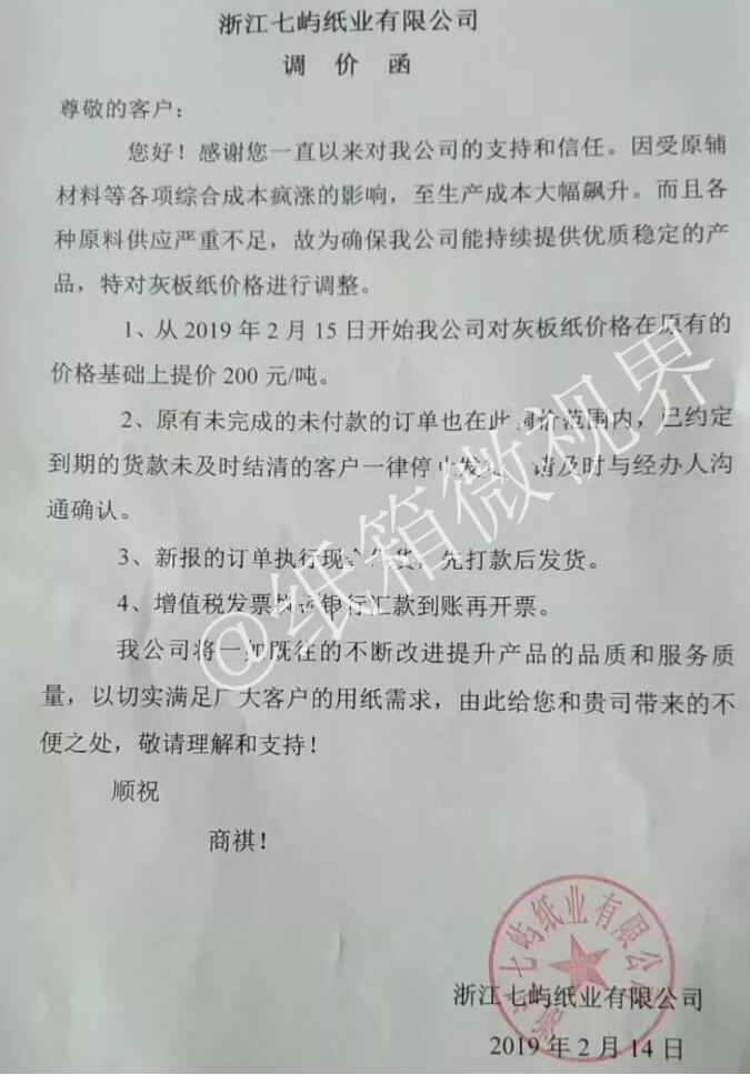 2月14日,浙江七嶼紙業有限公司發布漲價函: 自2019年2月15日起,灰板紙價格在原有價格基礎上提價200元/噸。 原有未完成的未付款訂單也在此調價范圍內,已約定到期的貨款未及時結清的客戶一律停止發貨。 新報的訂單執行現金供貨,先打款后發貨。