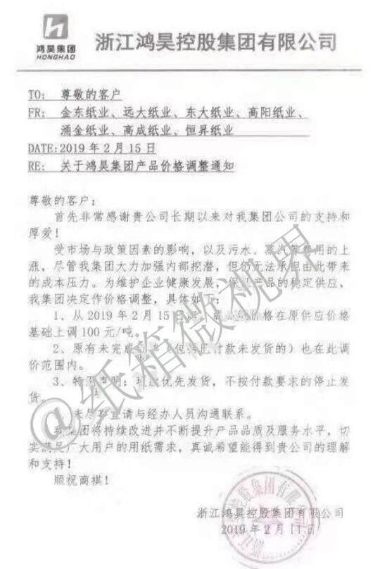 2月11日,浙江鴻昊控股集團有限公司發布漲價函: 自2019年2月15日起,成品紙價格在原供應價格基礎上上調100元/噸。 原有訂單(包括已付款未發貨的)也在此調價范圍內。 特別聲明:現款優先發貨,不按付款要求的停止發貨。