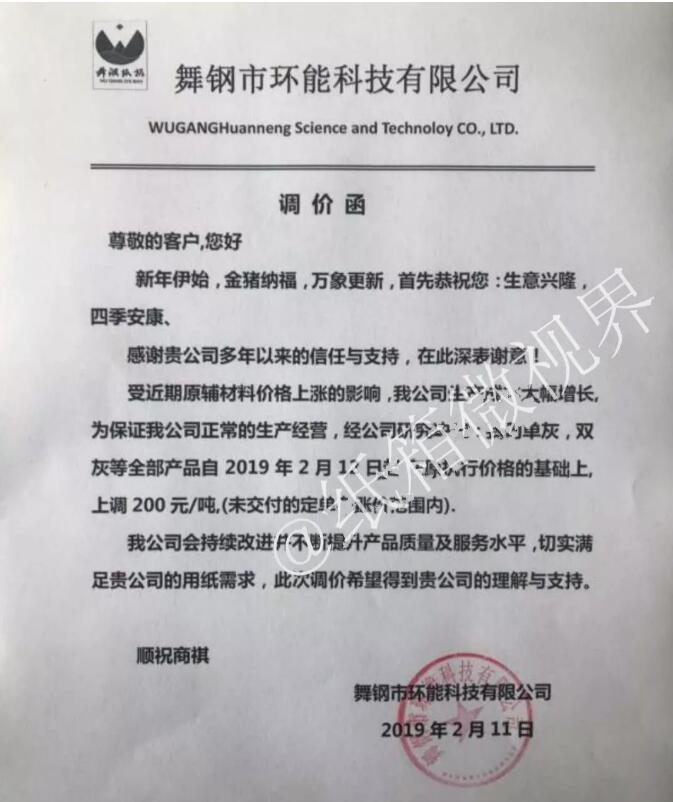 2月11日,舞鋼市環能科技有限公司發布漲價函: 自2019年2月12日起,在原執行價格基礎上上調200元/噸。