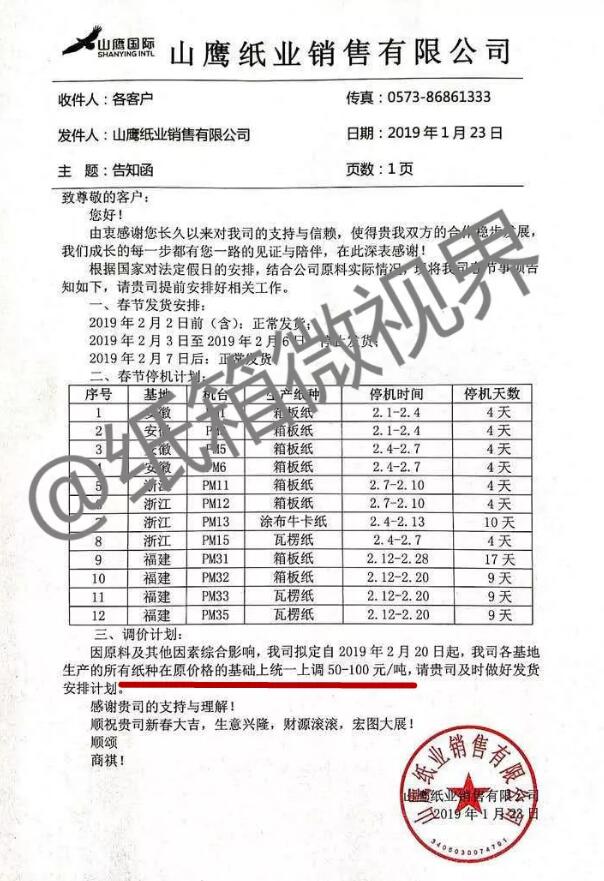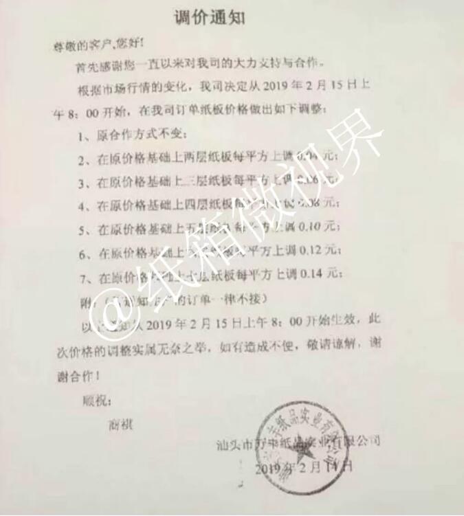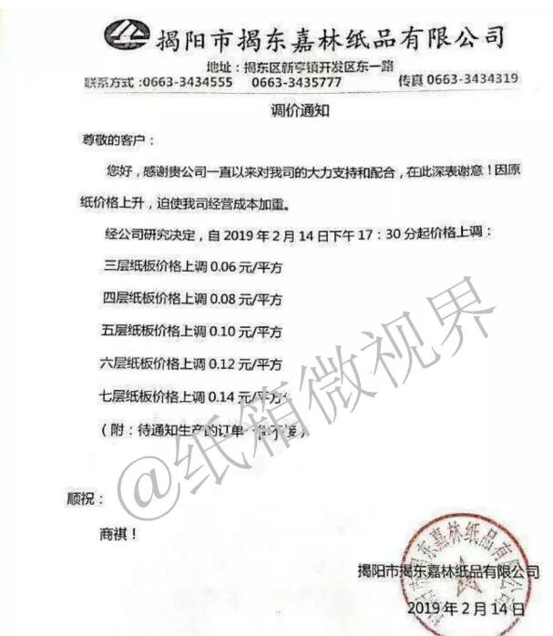2月14日,揭陽市揭東嘉林紙品有限公司發布漲價函: 自2019年2月14日下午17:30起: 三層紙板上漲0.06元/平方 四層紙板上漲0.08元/平方 五層紙板上漲0.10元/平方 六層紙板上漲0.12元/平方 七層紙板上漲0.14元/平方 待通知生產的訂單一律不接。
