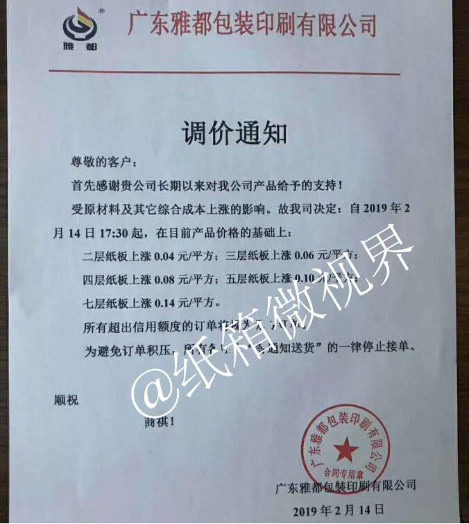 2月14日,廣東雅都包裝印刷有限公司發布漲價函: 自2019年2月14日17:30起: 二層紙板上漲0.04元/平方 三層紙板上漲0.06元/平方 四層紙板上漲0.08元/平方 五層紙板上漲0.10元/平方 七層紙板上漲0.14元/平方 所有超出信用額度的訂單均視為無效訂單。 所有備注為“等通知送貨”的一律停止接單。