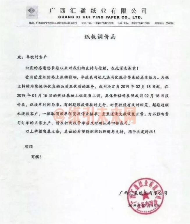 2月18日,廣西匯盈紙業(yè)有限公司發(fā)布漲價函: 2019年2月18日起,在2019年1月15日的價格基礎(chǔ)上做適當(dāng)上調(diào),具體價格請參照公司2月18日報價表,以接單時間為準(zhǔn)。 有到期賬款請按時支付,對貨款沒有及時回籠,超期超額未還款客戶,一律取消舊單供貨及停止接單,直至還清欠款恢復(fù)正常。