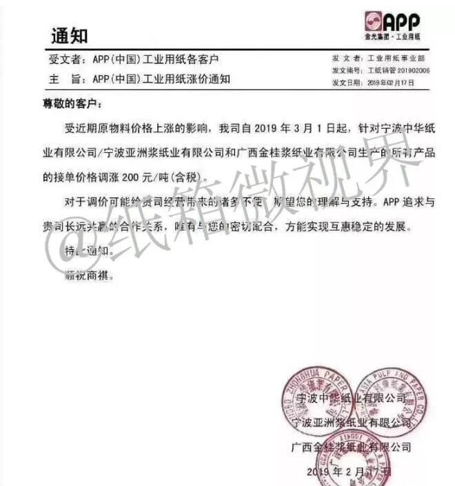2月17日,APP發(fā)布漲價函: 2019年3月1日起,寧波中華紙業(yè)有限公司/寧波亞洲漿紙業(yè)有限公司和廣西金桂漿紙業(yè)有限公司生產(chǎn)的所有產(chǎn)品接單價格調(diào)漲200元/噸(含稅)