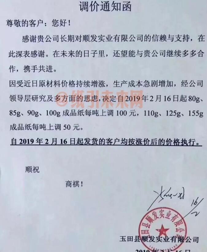 2月16日,玉田縣順發(fā)實業(yè)有限公司發(fā)布漲價函: 2019年2月16日起80g、85g、90g、100g成品紙每噸上調(diào)100元,110g、125g、155g成品紙每噸上調(diào)50元。 自2019年2月16目起發(fā)貨的客戶均按漲價后的價格執(zhí)行。