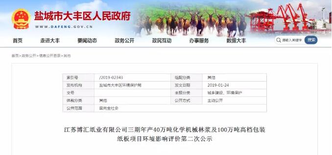 導語:江蘇省鹽城市大豐區(qū)人民政府在今年初公示了江蘇博匯紙業(yè)有限公司三期年產40萬噸化學機械林漿及100萬噸高檔包裝紙板項目環(huán)境影響評價文件。該項目投資總額38.3億元,預計2020年12月投產。